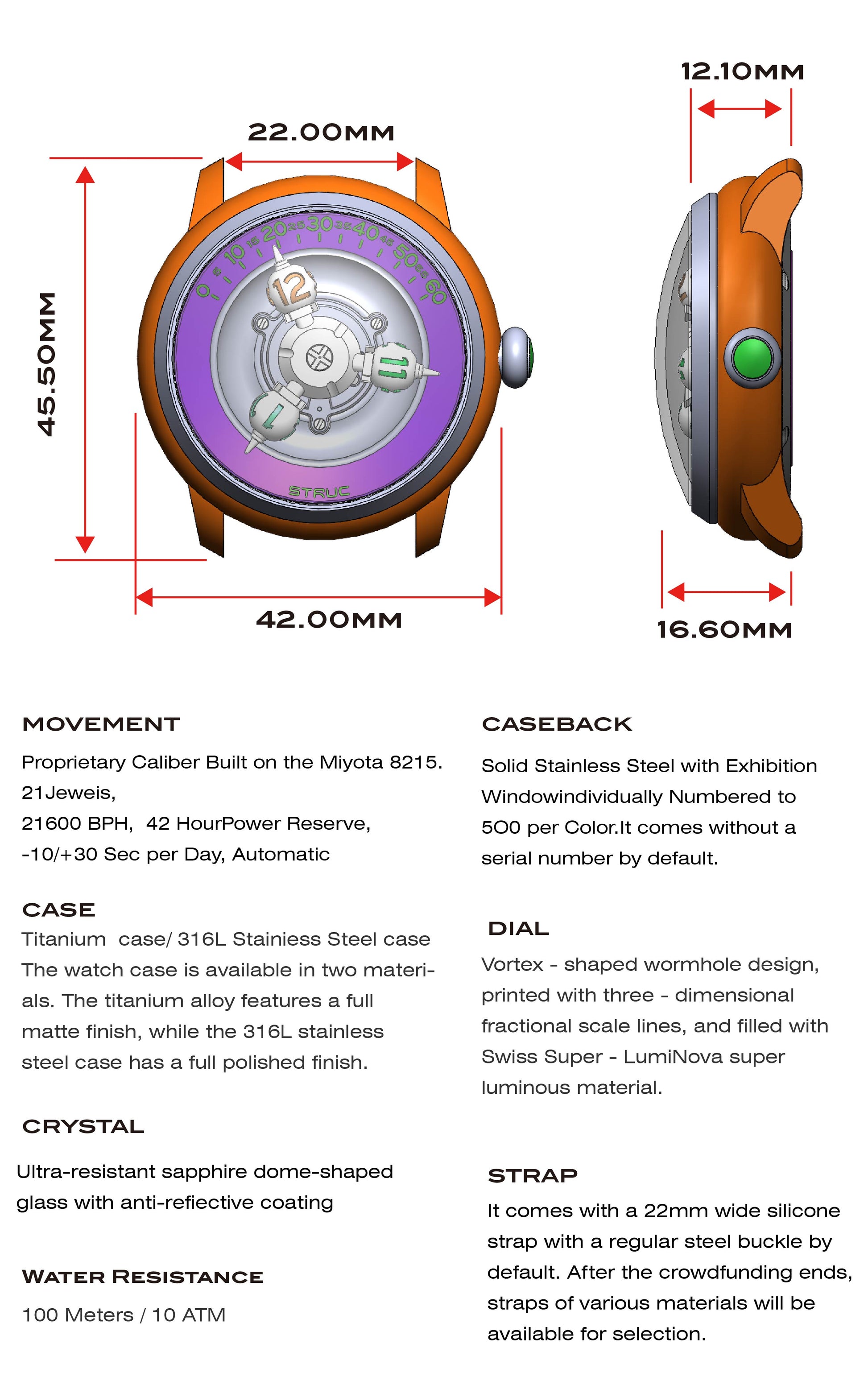 Design Highlights Movement: Reliable Japanese Miyota 8215 automatic movement with 42-hour power reserve. Case Material: Choice of aerospace-grade titanium or 316L stainless steel for durability and lightweight comfort. Dial Display: Three rotating spheres indicate hours, minutes, and orbital motion, creating a unique visual experience. Luminescence: Swiss Super-LumiNova BGW9 — bright blue glow at night, white in daylight. Eco‑friendly, non‑radioactive, and retains 6–7 hours of brightness with sufficient light charge. Sapphire Crystal: Double-domed sapphire with multi‑layer anti‑reflective coating. Highly resistant to scratches, heat, and chemicals for lasting clarity. Water Resistance: 10 ATM / 100 meters, suitable for daily wear and splash resistance.